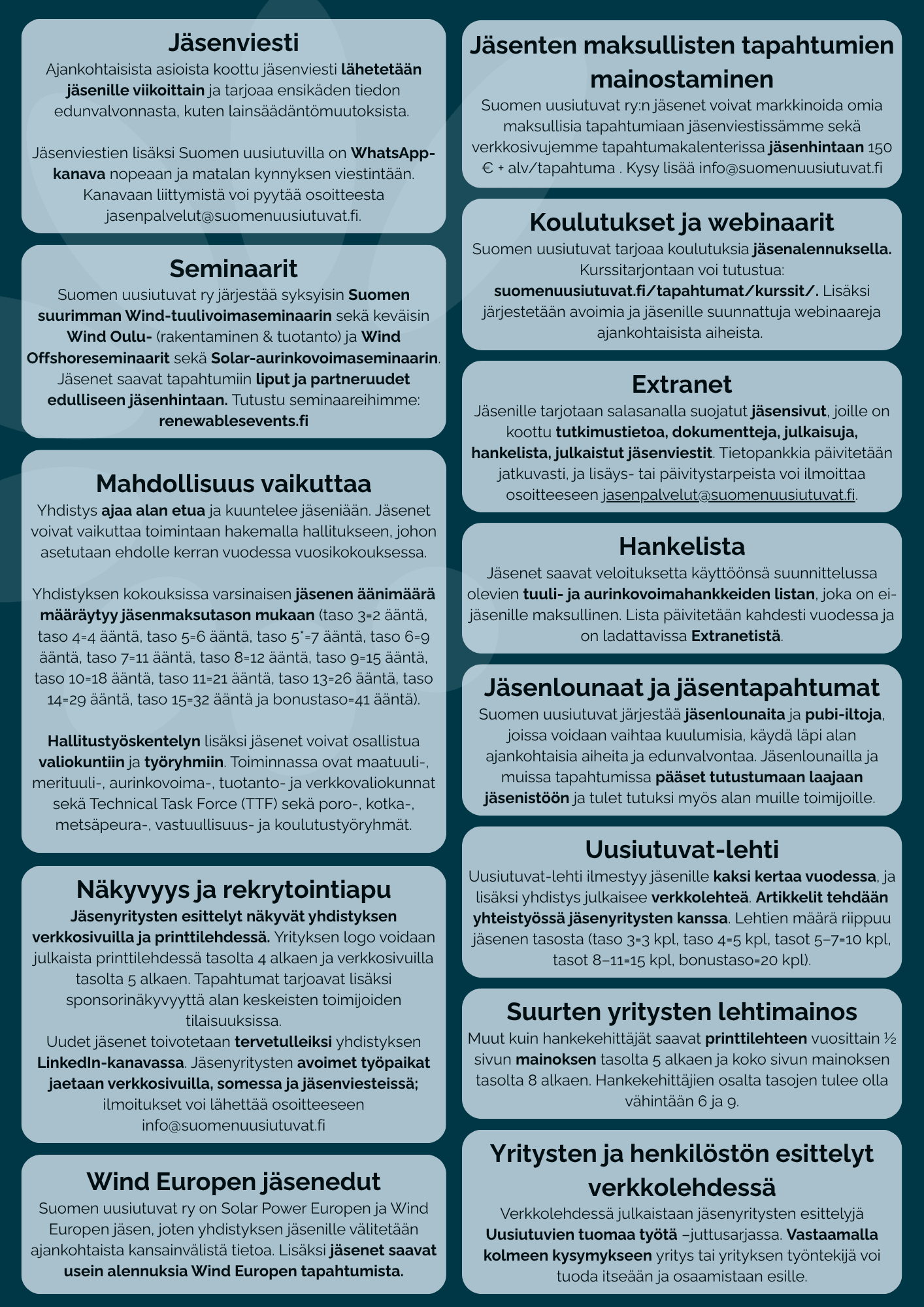 Suomen uusiutuvat ry:n yritysjäsenet saavat ensikäden tietoa ajankohtaisista asioista, ja pääsevät yhdistyksen hallituksessa ja valiokunnissa vaikuttamaan uusien toimintatapojen ja -linjausten suunnitteluun ja toteuttamiseen. Jäsenilloissa ja muissa tapahtumissa pääset tutustumaan laajaan jäsenistöön ja tulet tutuksi myös alan muille toimijoille. Organisaatiosi saa näkyvyyttä alan ykkösjulkaisussa Uusiutuvat -lehdessä ja yhdistyksen verkkosivuilla. Tarjoamme myös mahdollisuuden julkaista lehdessä juttuja ja artikkeleita.